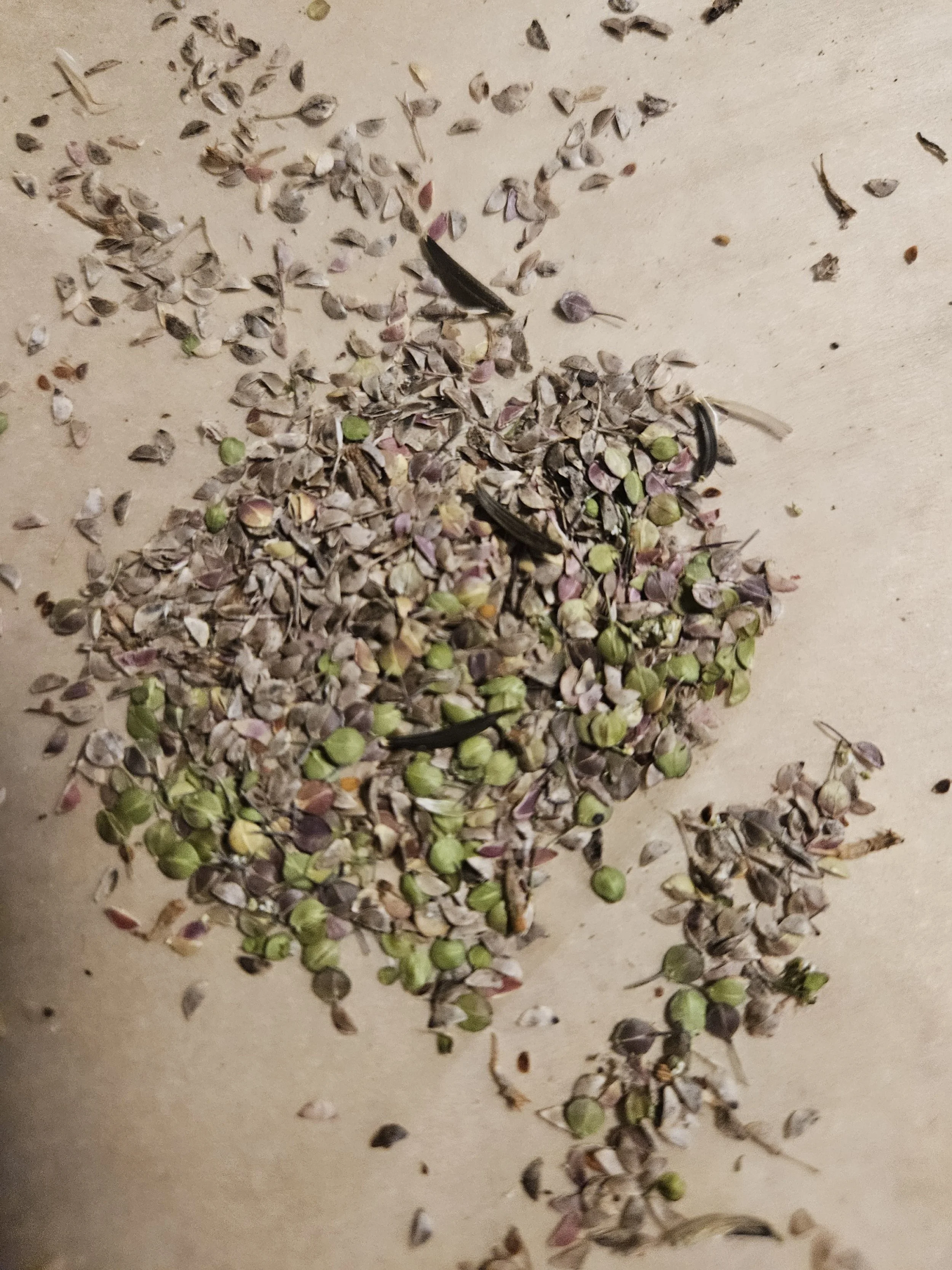 These pennycress seeds are still in the process of drying out. You can see there is a mix of green pods (still drying) and brown pods (completely dry). We will store them once they all turn brown.