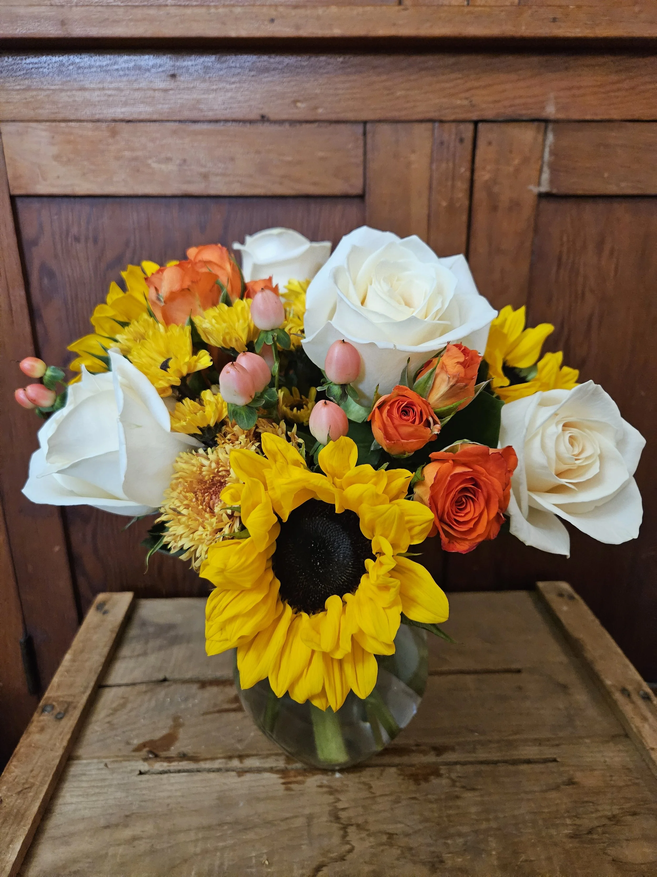 A mid height vase arrangement featuring warm copper tones, oranges, and yellows with a hint of white.